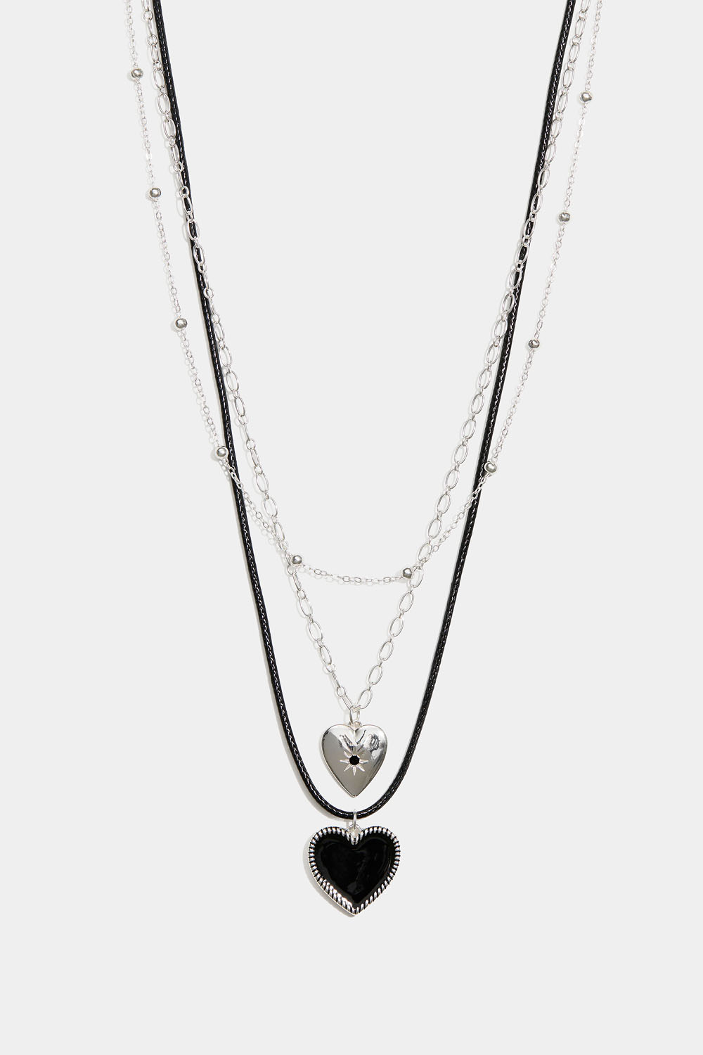 Halskæde med to kæder og en sort snor med hængende hjerter.
