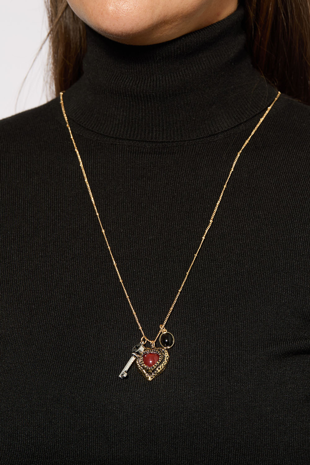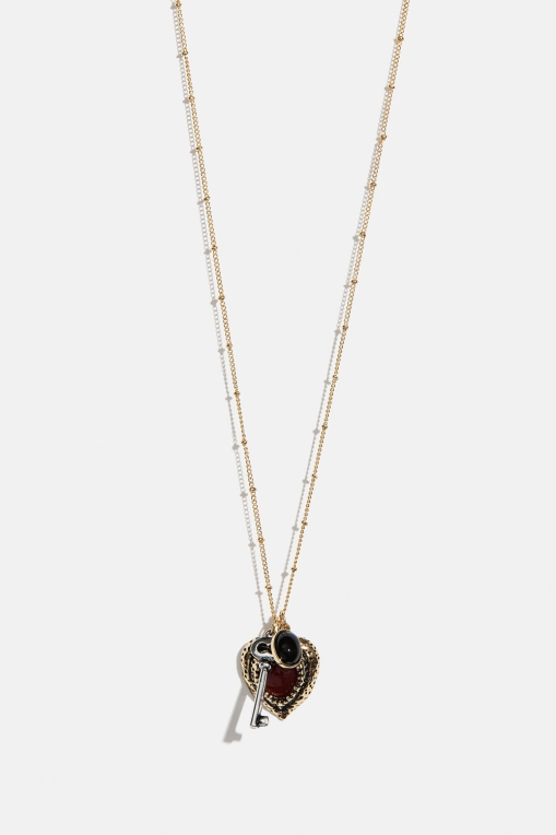 Lang metalhalskæde med tre charms i form af en nøgle, et hjerte og en oval sort akrylsten.