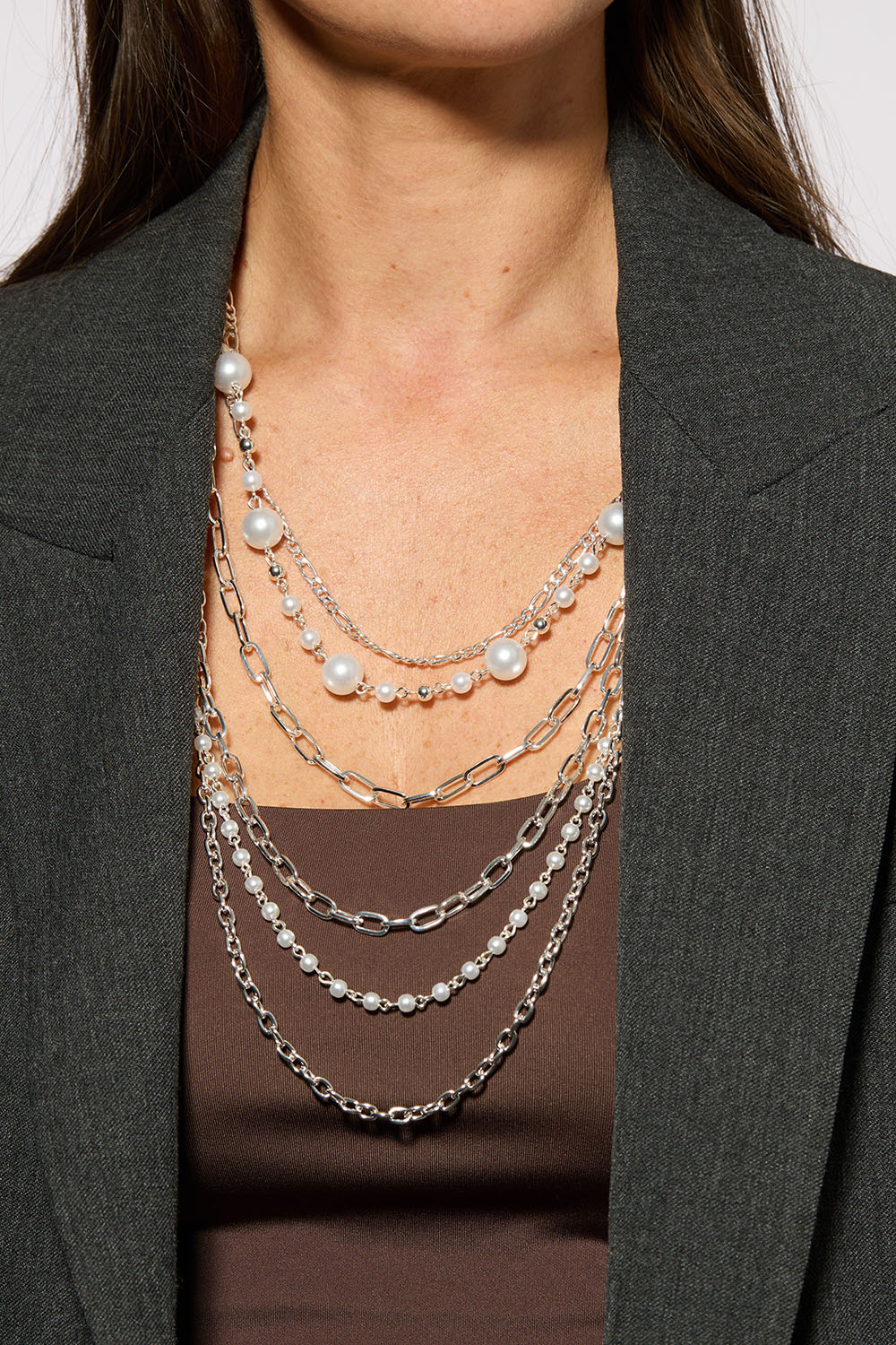 Lang halskæde med 6 kæder i forskellige designs, to dekoreret med hvide runde perler.