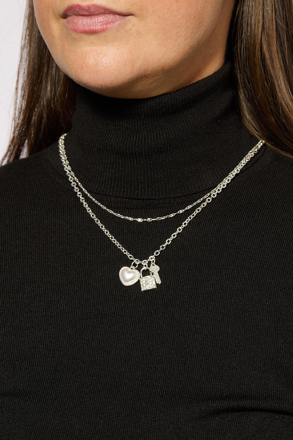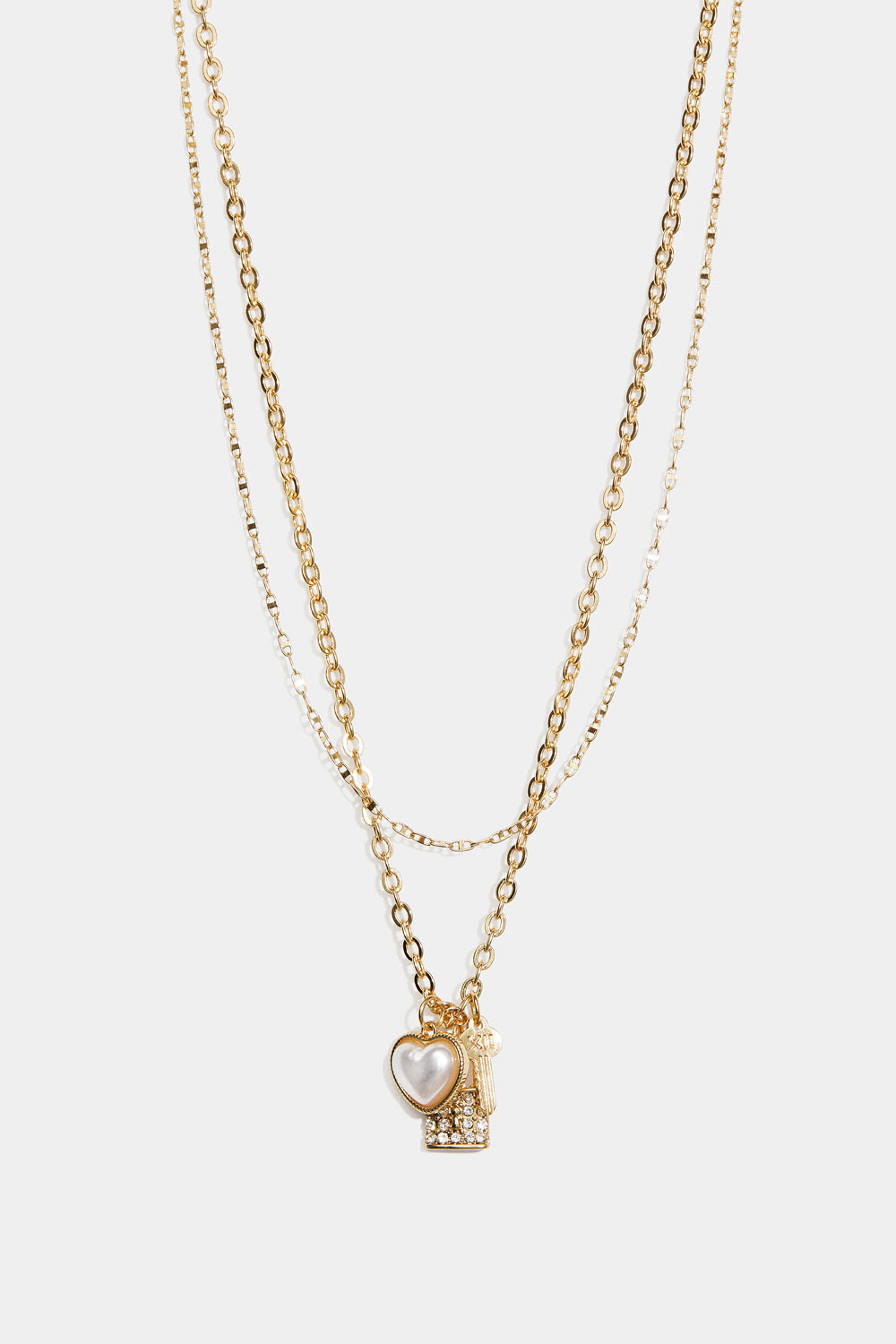 Dobbelt halskæde i guldfarvet metal med tre charms. En med en hjerteformet perle i perlemorsfinish, en nøgle og en hængelås med rhinsten.