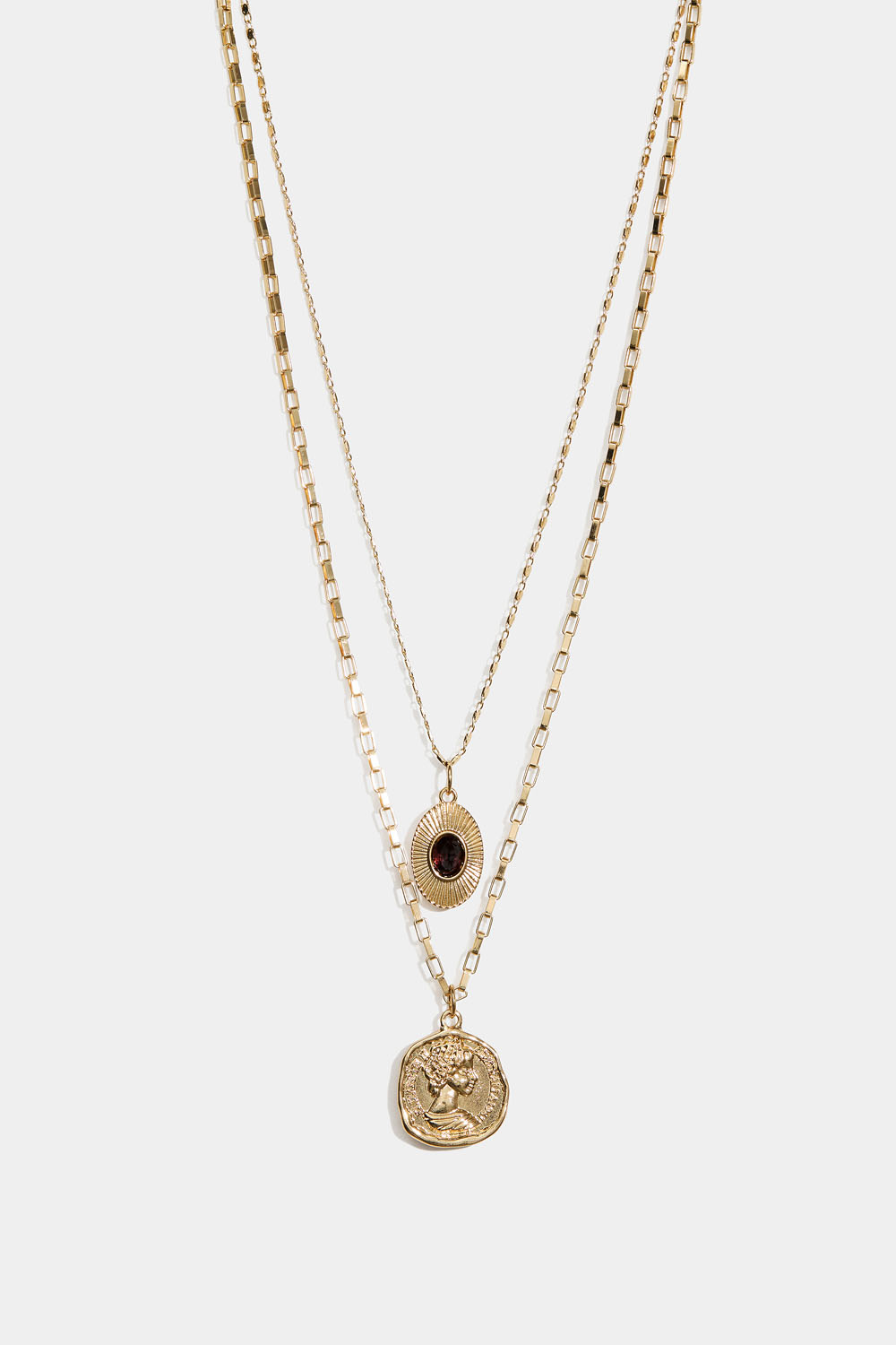 Dobbelt halskæde med to hængende charms. En med møntmotiv og en oval med en bordeauxrød sten i resin.