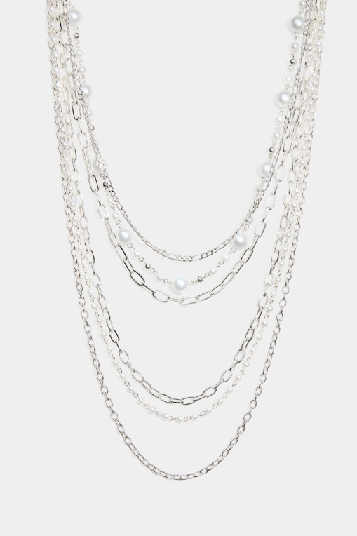 Lang halskæde med 6 kæder i forskellige designs, to dekoreret med hvide runde perler.