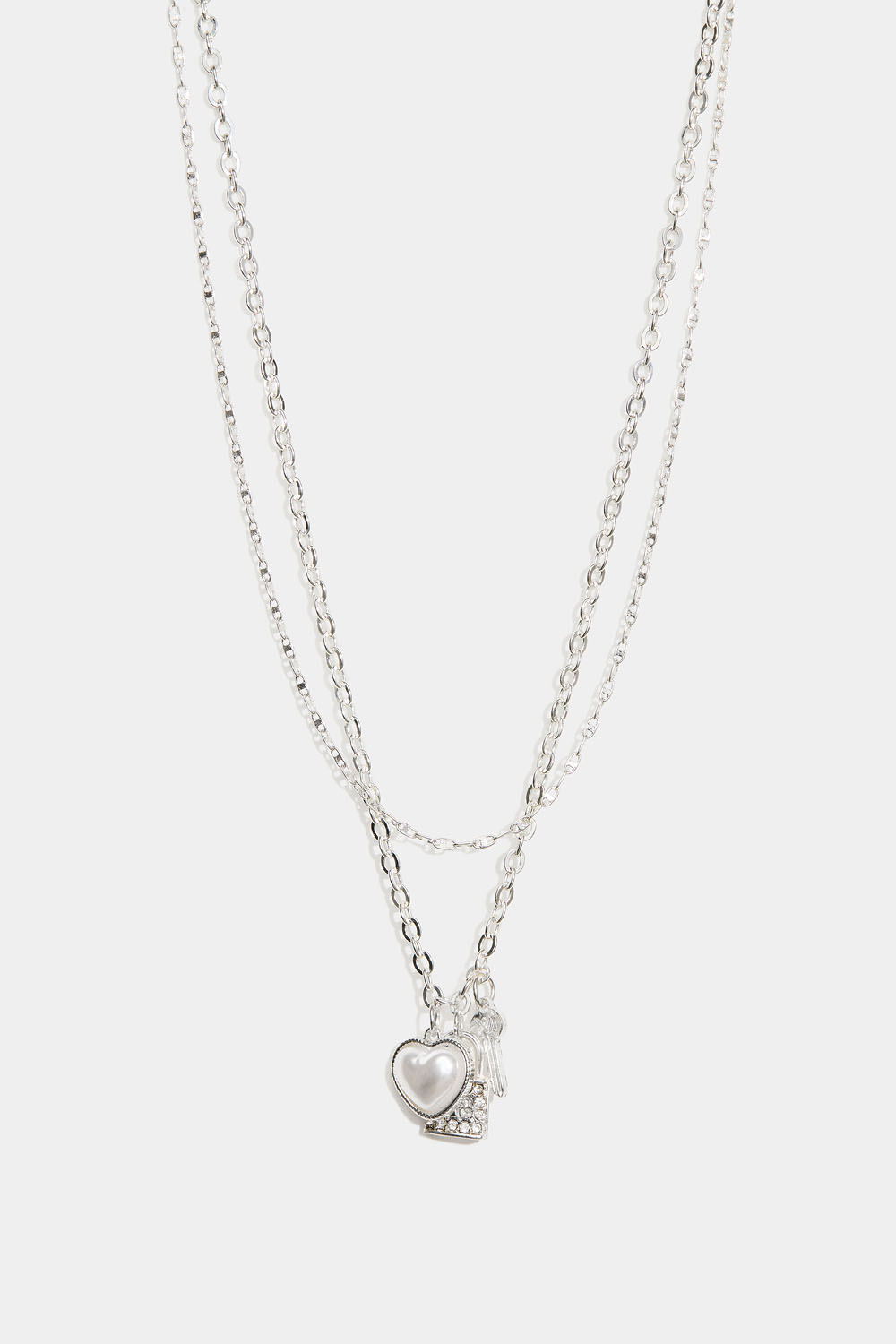 Dobbelt halskæde i sølvfarvet metal med tre charms. En med en hjerteformet perle i perlemorsfinish, en nøgle og en hængelås med rhinsten.
