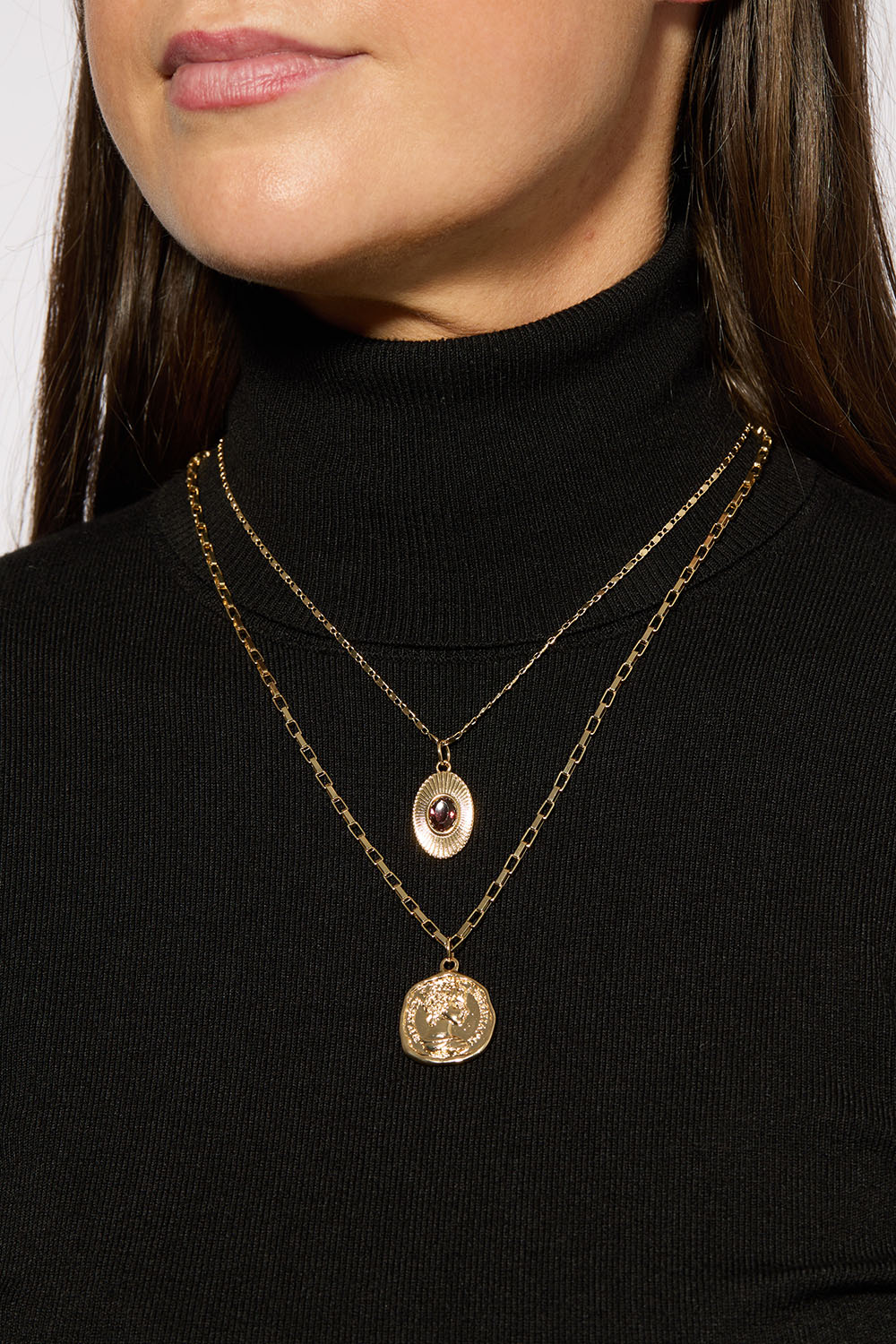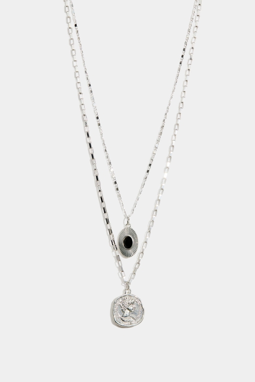 Dobbelt halskæde med to hængende charms. En med møntmotiv og en oval med sort sten i resin.