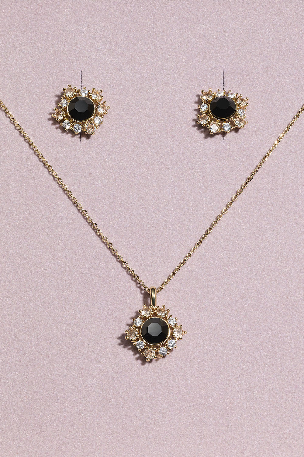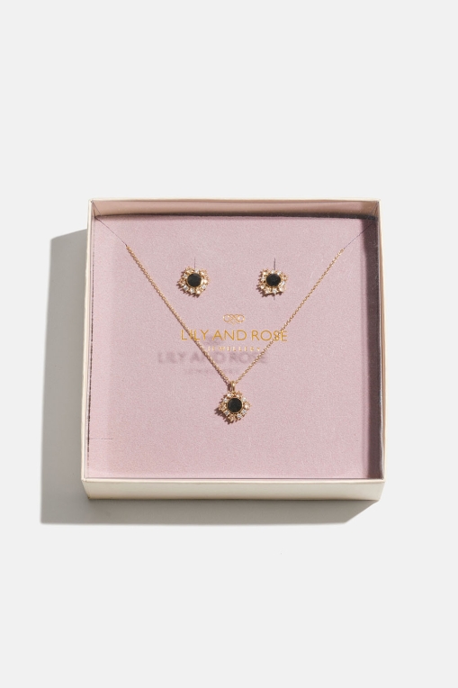 Vores Emily-halskæde og -øreringe stråler af lys og består af en dragende, kulsort krystal og en smuk sammensætning af mindre, mystiske opaler og klare krystaller. Indfattet i guld. Fuldend dit look med andre elementer fra vores Emily-kollektion.