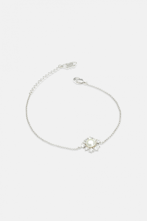 Vores Emily-armbånd stråler af lys og har en smuk elfenbensfarvet perle, der sammen med mindre klare sølvkrystaller skaber et fantastisk ensemble. Indfattet i sølv. Fuldend dit look med andre elementer fra vores Emily-kollektion.
