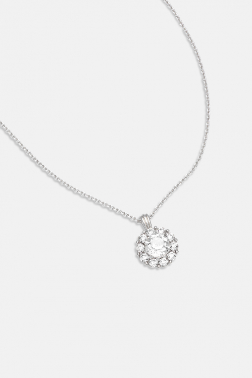 Det udsøgte design er virkelig alsidigt og passer til enhver stil og lejlighed. Krystalle skaber et midtpunkt af en multifacetteret, klar krystal indrammet af mindre sten på en sølvkæde. En øjeblikkelig favorit.