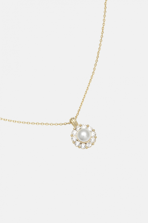 Det udsøgte design er virkelig alsidigt og passer til enhver stil og lejlighed. Dette smykke har en delikat perle i midten, indrammet af mindre, strålende klare krystaller på en guldkæde. En øjeblikkelig favorit."
