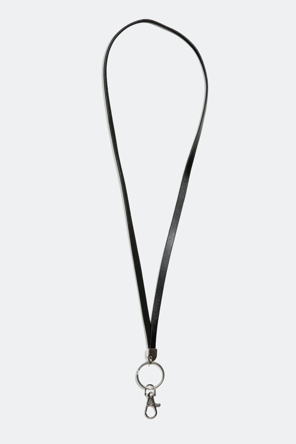 Nøglering med langt, smalt bånd i imiteret læder. Nøglebåndet har en karabin krog og en rund metalnøglering.