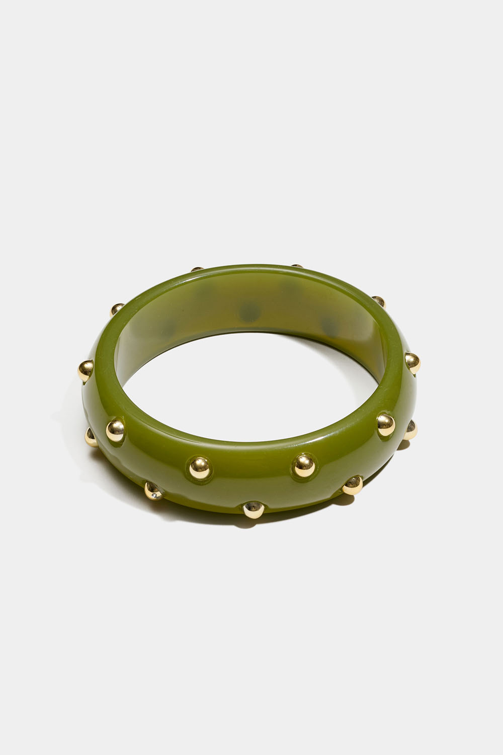 Bredt armbånd i olivengrøn akryl og runde guldfarvede nitter.