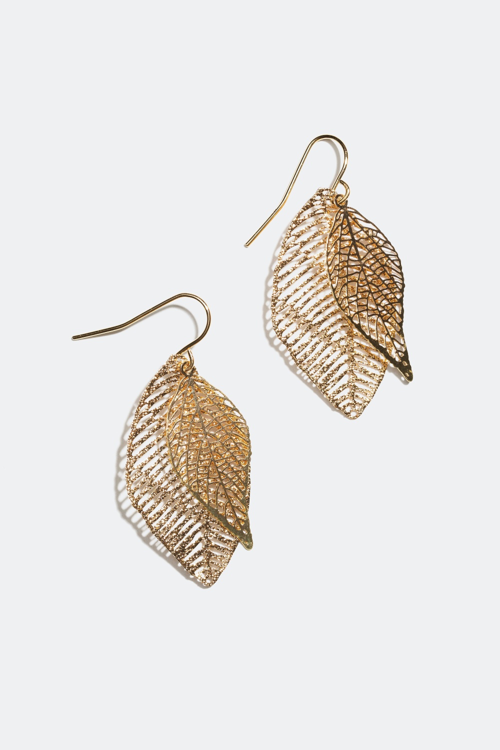 Øreringe med to blade med dekorative udskæringer. Det store blad har en børstet overflade og det mindre blad har en blank overflade. Øreringene findes i både sølv- og guldfarvet metal.
