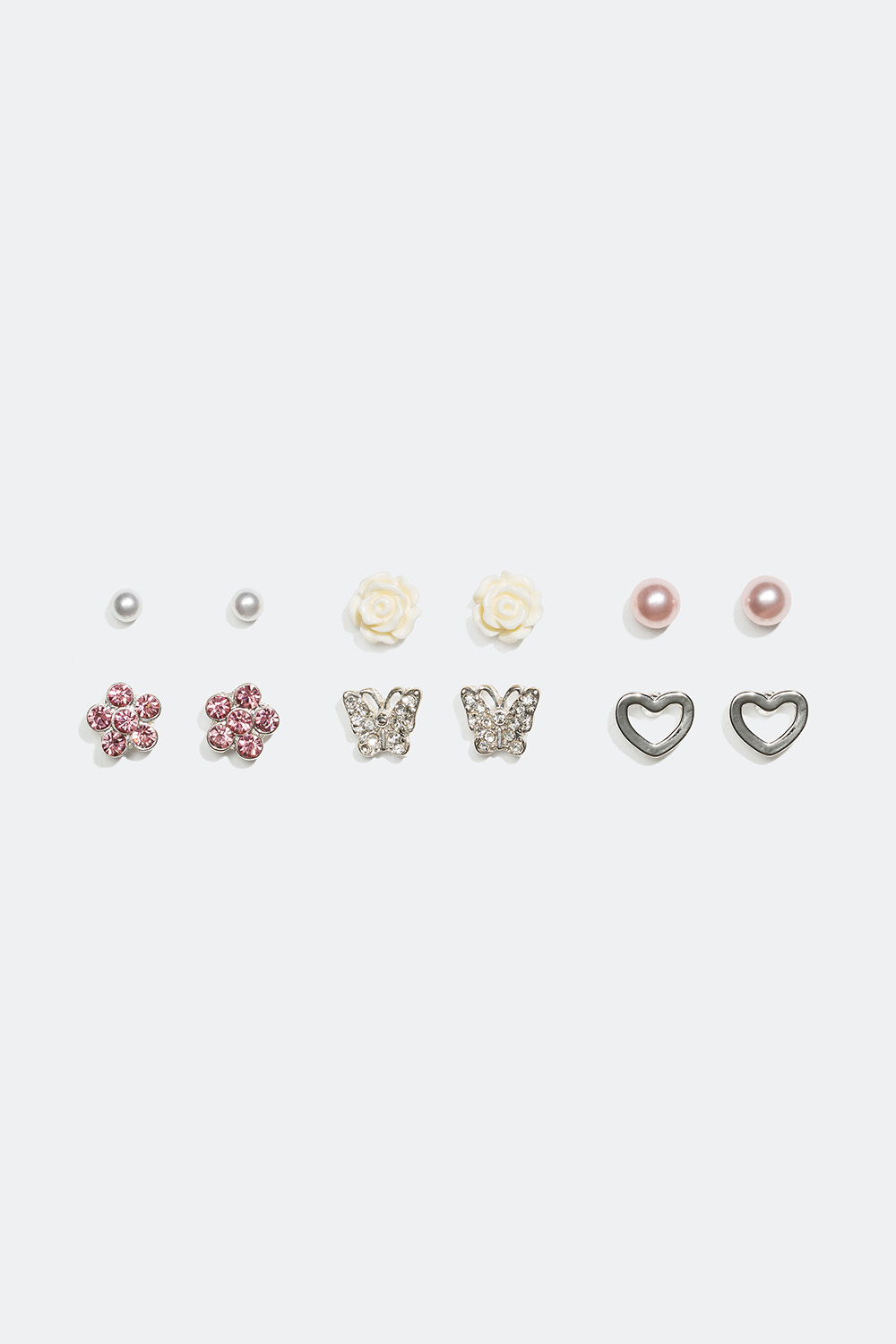 Øreringe blandet, 6-par - Seks par blandet øreringe i metal. To par øreringe i form af blomster, et par i form af hjerte, et par i form af sommerfugl og to par med plastperler.
