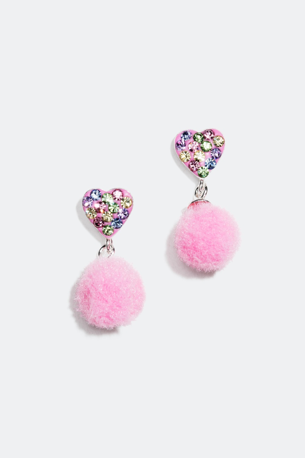 Øreringe i ægte sølv med hjerter pyntet med similisten i forskellige farver samt en lyserød blød bold.
