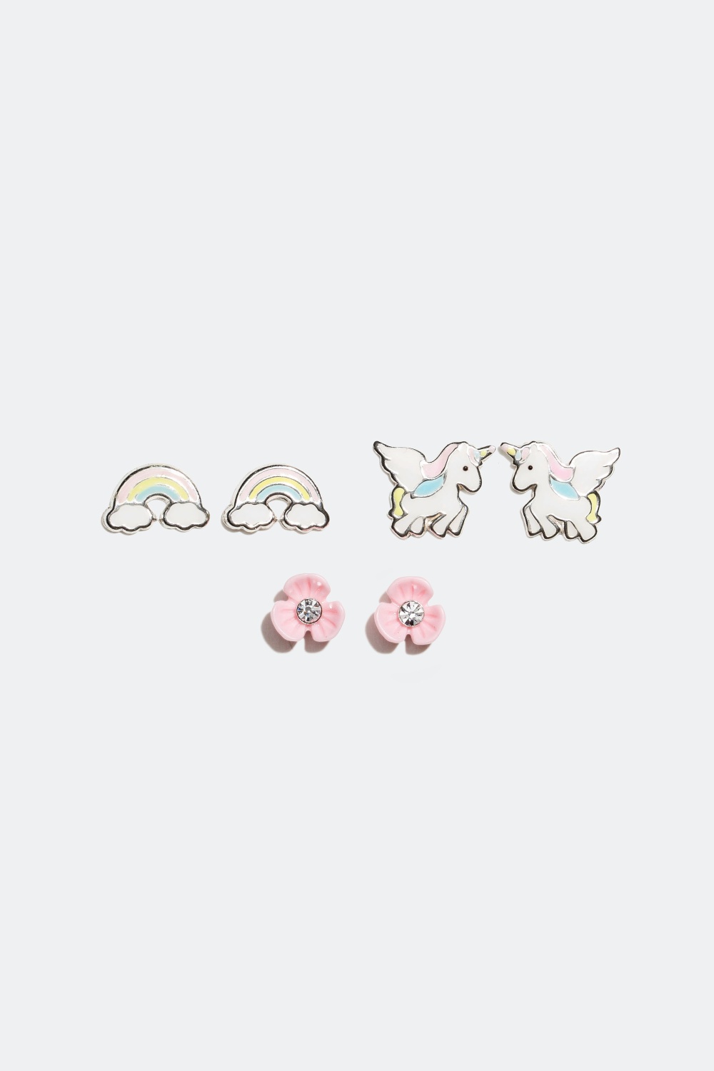 Tre par øreringe i ægte sølv. Øreringene er formet som en enhjørning, en regnbue og en lyserød blomst. Blomsten er pyntet med glassten og de andre par er i farverne hvid, lyserød, guld og blå.