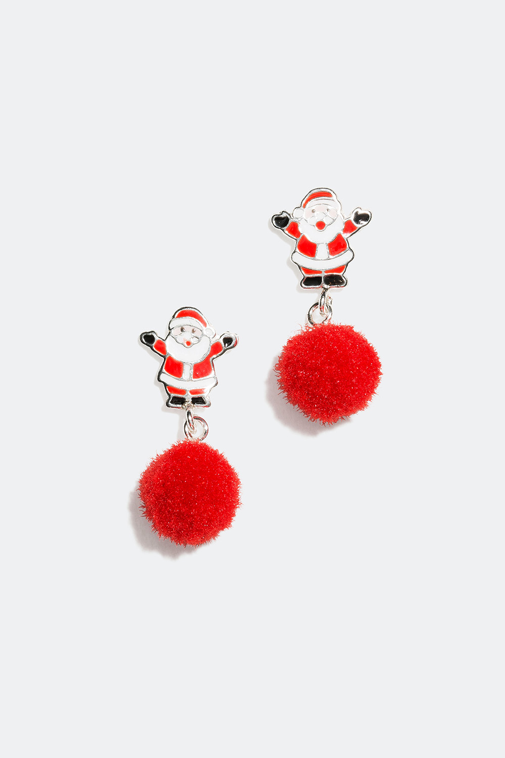 Ørestikker i ægte sølv med motiv med julemand i rød, hvid og sort med et vedhæng bestående af en rød stofkugle.