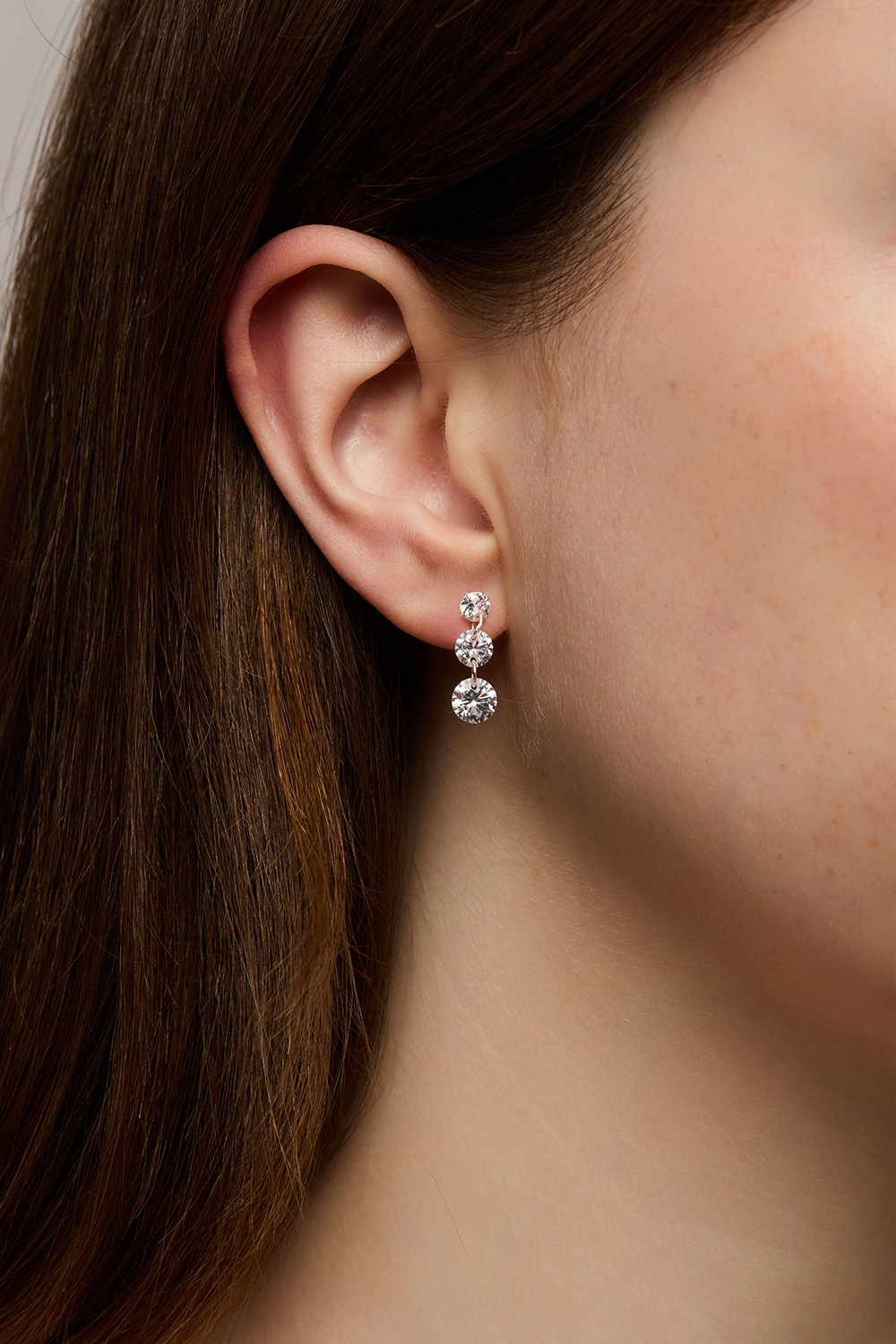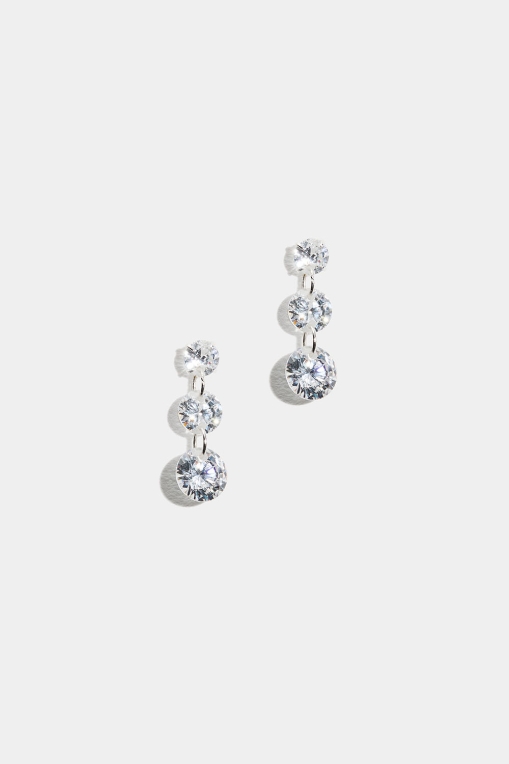 Øreringe i ægte sølv med tre hængende sten i kubisk zirkonia i faldende størrelse.