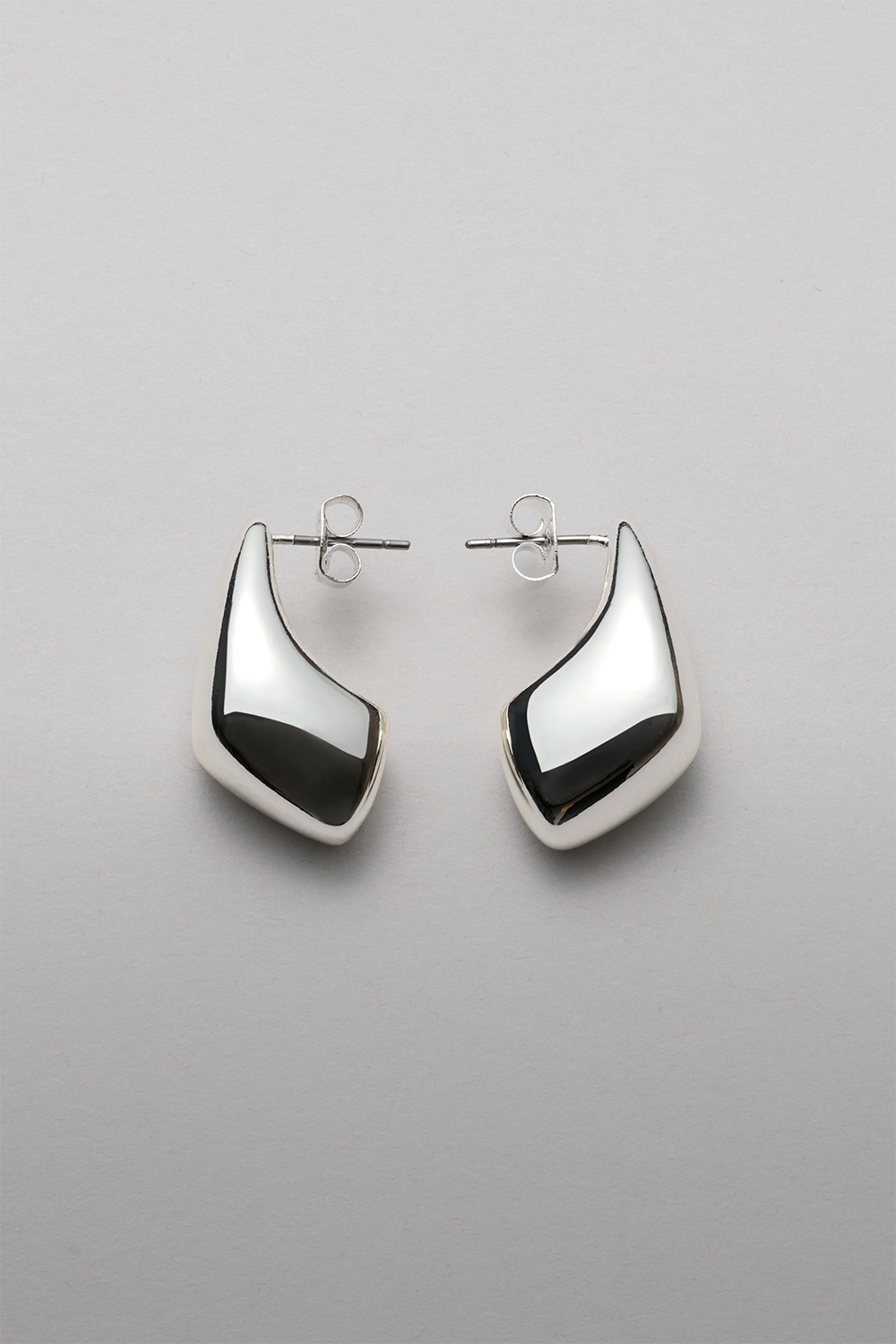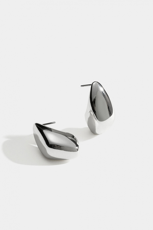 Øreringe i skinnende sølvfarvet metal i en kantet dråbeform