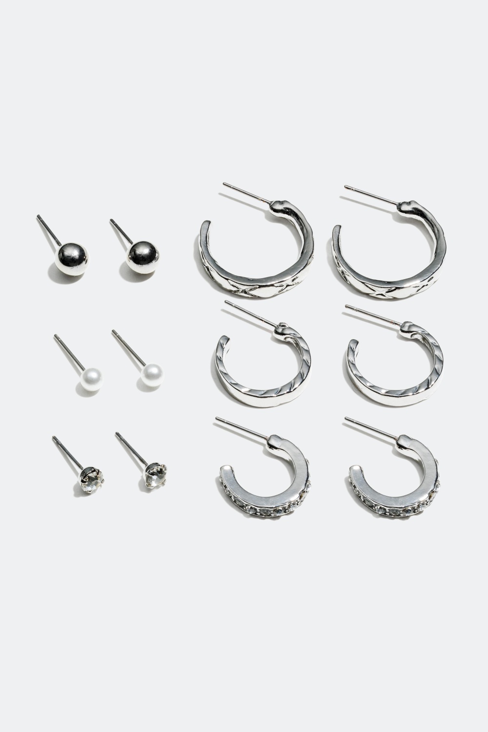 Øreringe i metal, 6-pack - Pakke med seks par øreringe. Pakken indeholder et par øreringe som er dekoreret med plastikperler, et par som er dekoreret med glassten, et par er med kugler, et par er blanke creoler med mønster på siderne, et par er creoler med mønster, og det sidste par er creoler dekoreret med glassten.