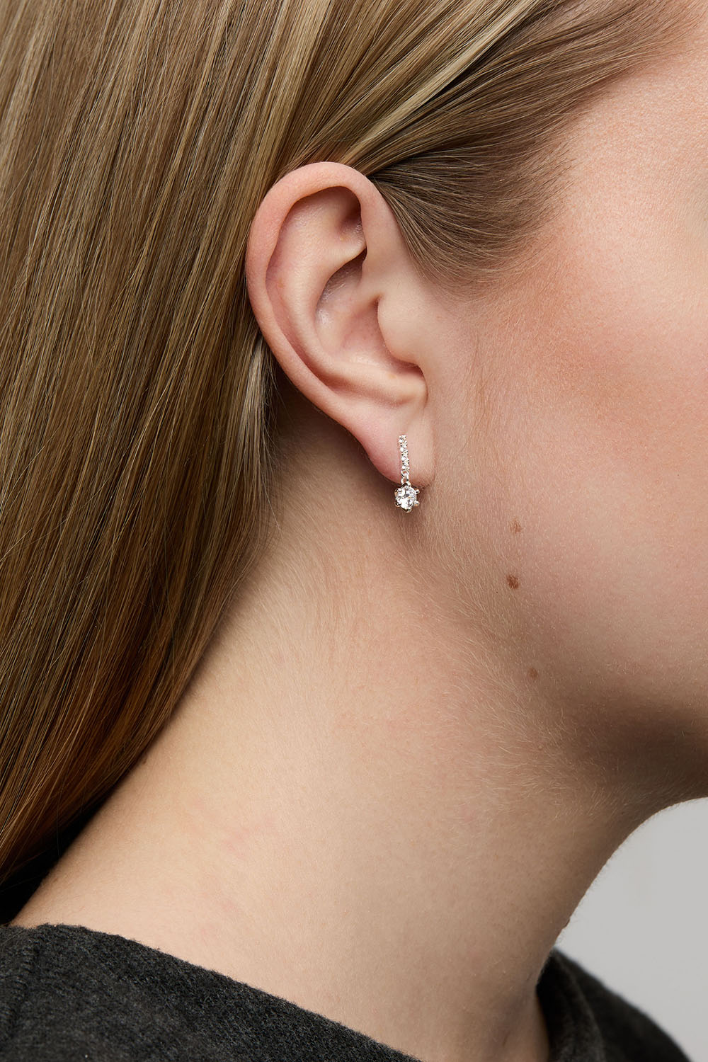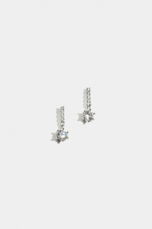Øreringe i ægte sølv med stave og et rundt vedhæng dekoreret med kubisk zirkonia-sten.