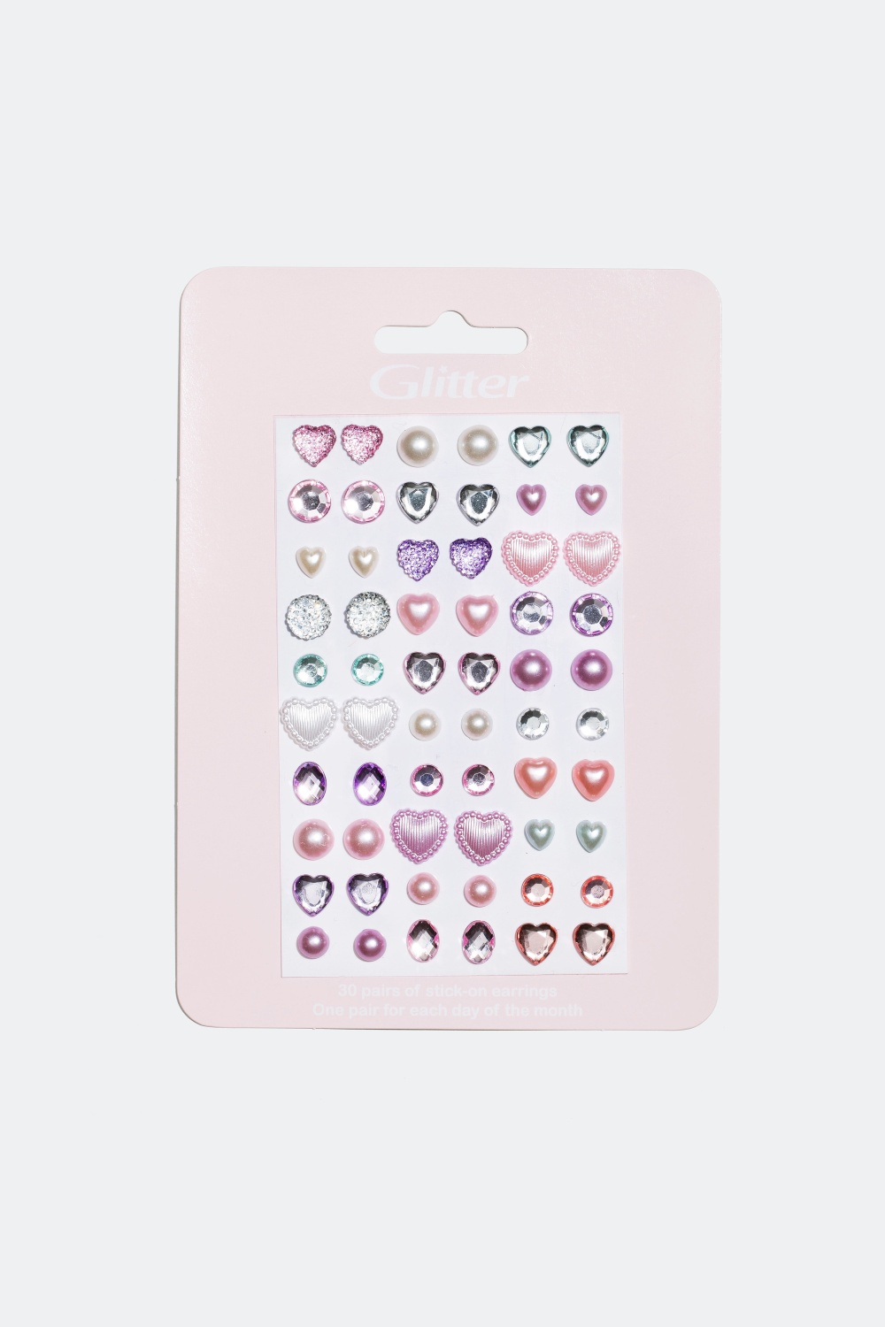 30 klistermærke-øreringe i former som hjerter og perler i forskellige størrelser. Øreringene er i farverne lyserød, hvid, lilla, hvid og blå.