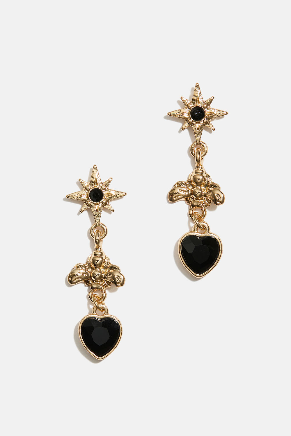 Øreringe i guldfarvet metal med stjerner, bier og hjerter dekoreret med sorte glassten.
