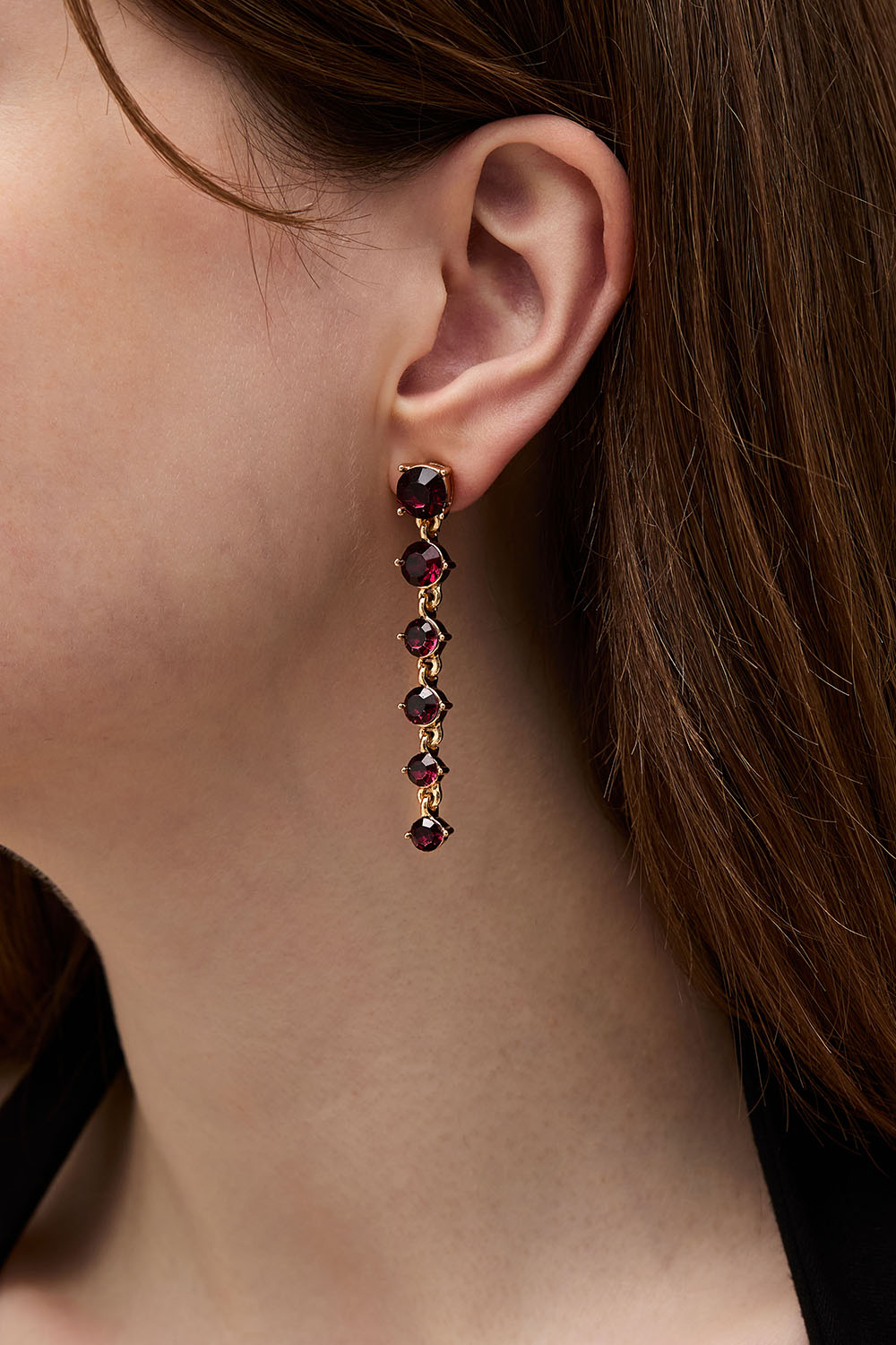 Øreringe i guldfarvet metal med runde bordeaux glassten i faldende størrelse.
