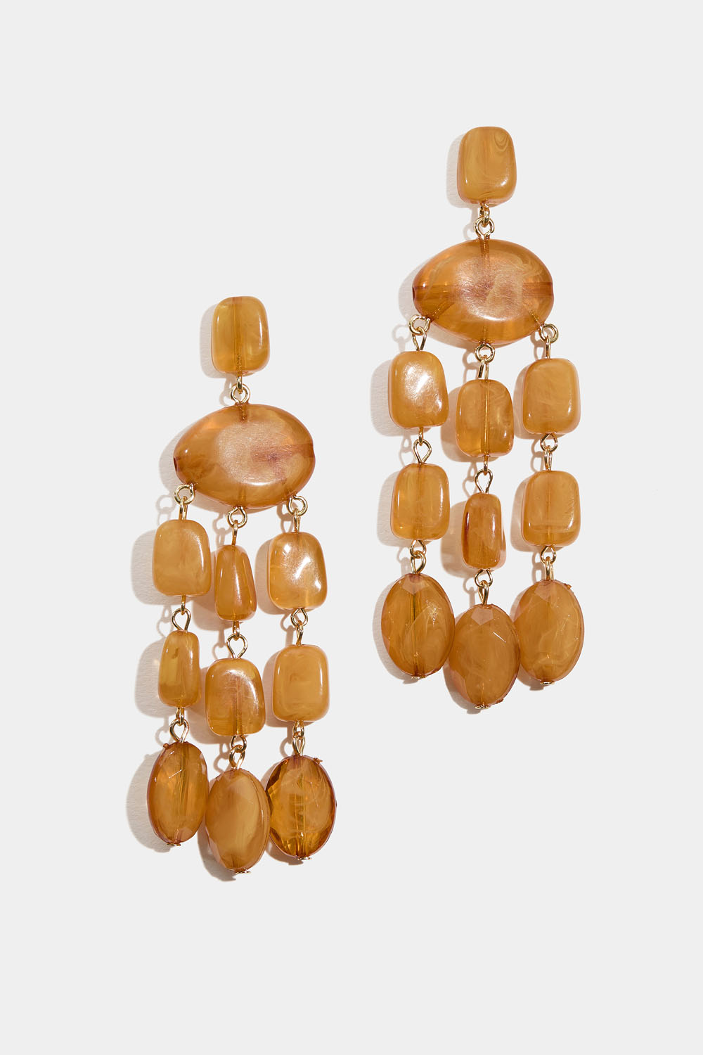 Øreringe med hængende perler i marmoreret brun-orange resin.