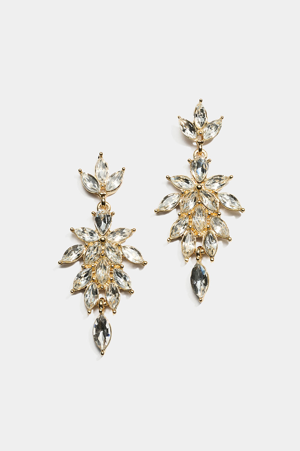 Øreringe i guldfarvet metal med hvide dråbeformede glassten i klynger.