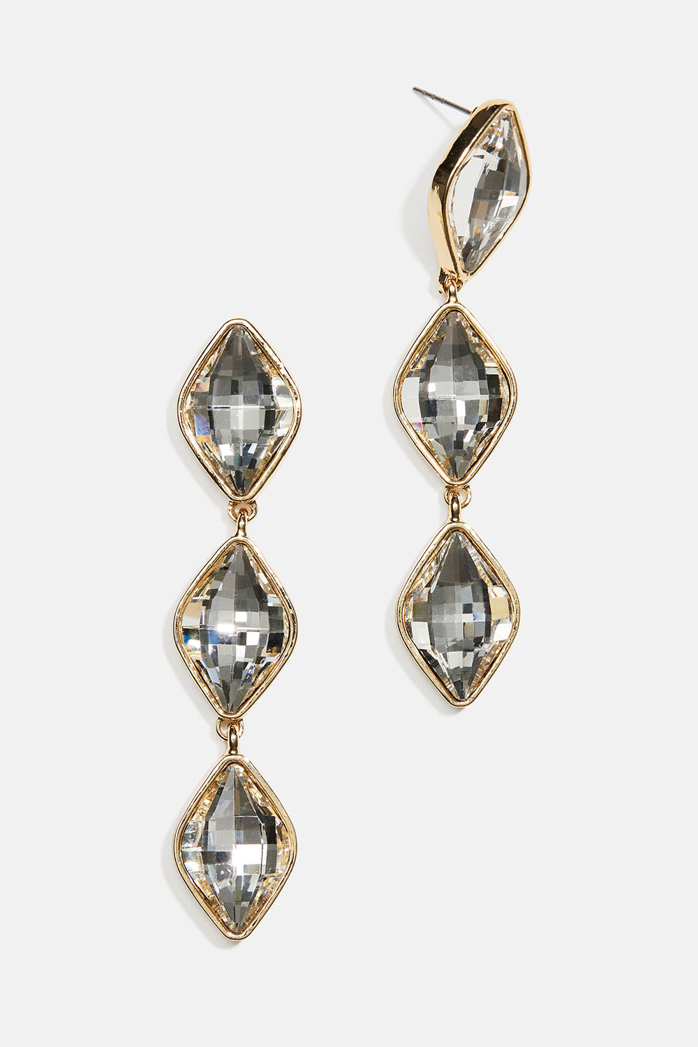 Øreringe i guldfarvet metal med tre, hængende, hvide glassten i diamantform.