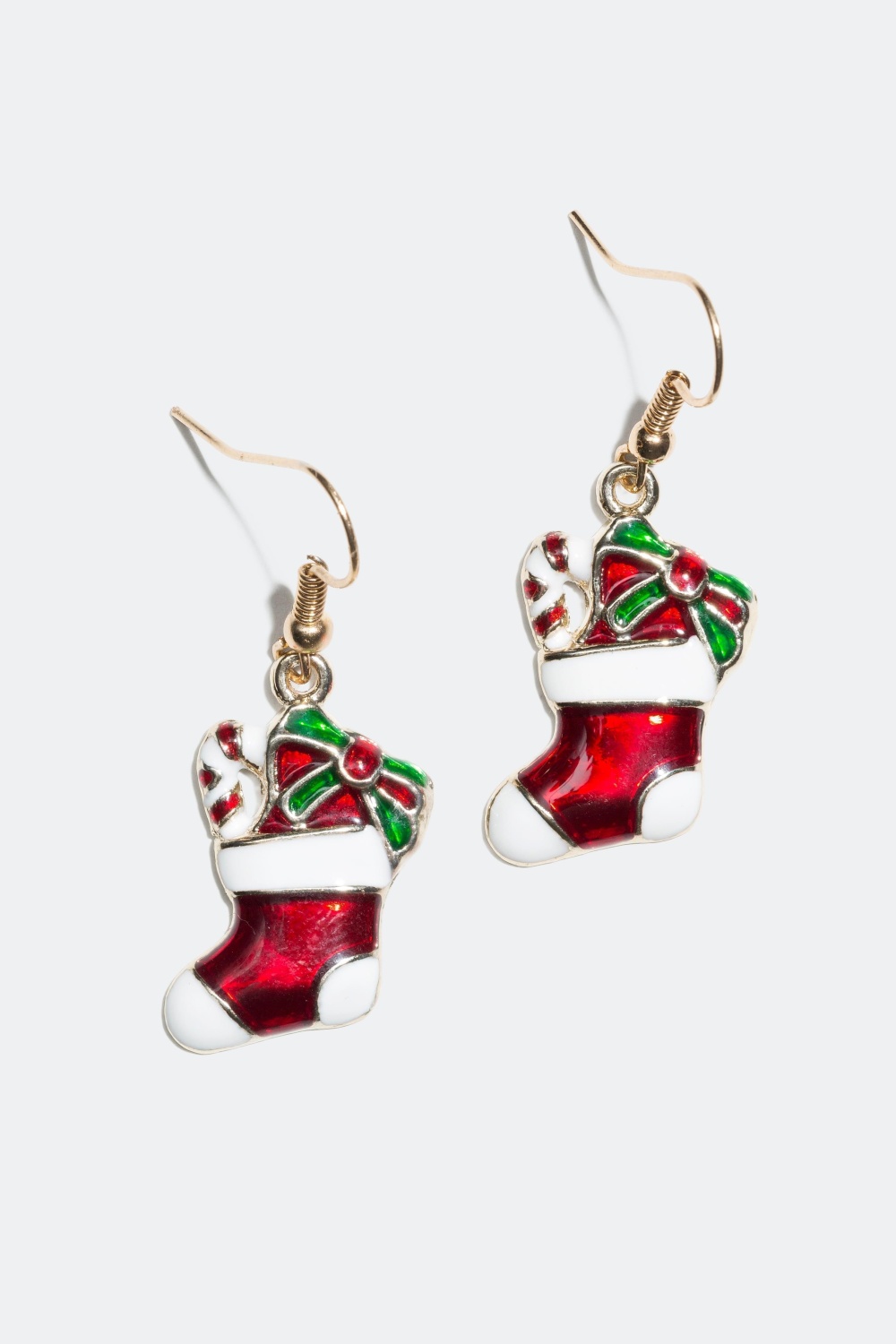 Øreringe med julestrømper - Sjove øreringe til julefesterne. Disse fine øreringe er formet som julestrømper med sløjfer og polkagrise.