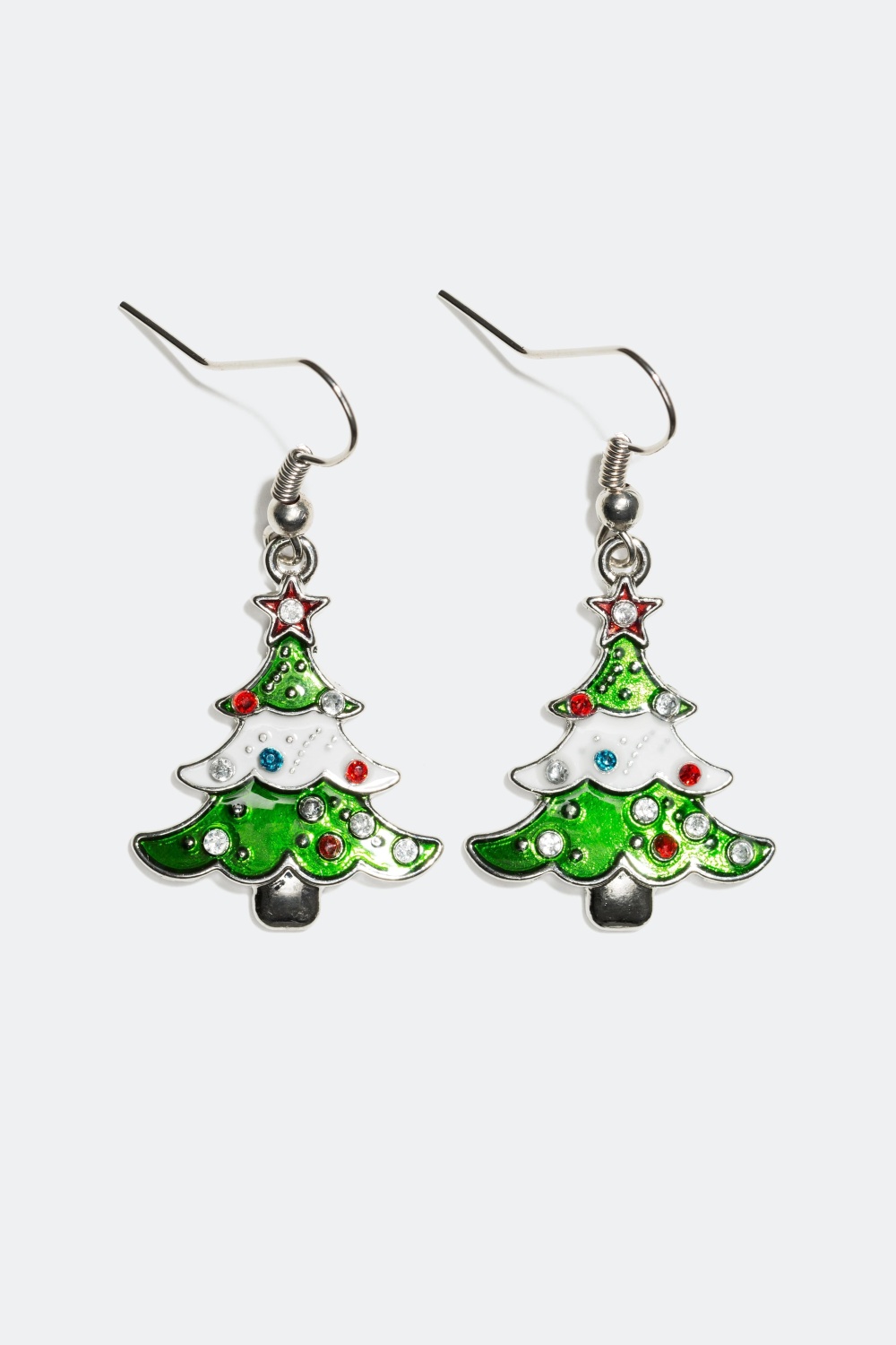 Øreringe med juletræer - Øreringe i metal med vedhæng formet som juletræer. Juletræet er dekoreret med små glassten i forskellige farver.