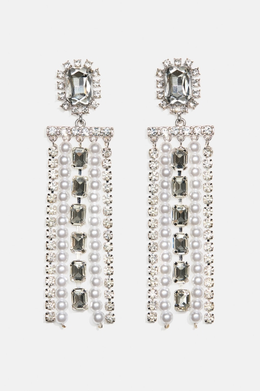 Øreringe med en store rektangulær glassten med små sten omkring og hængende led i similisten og hvide perler.