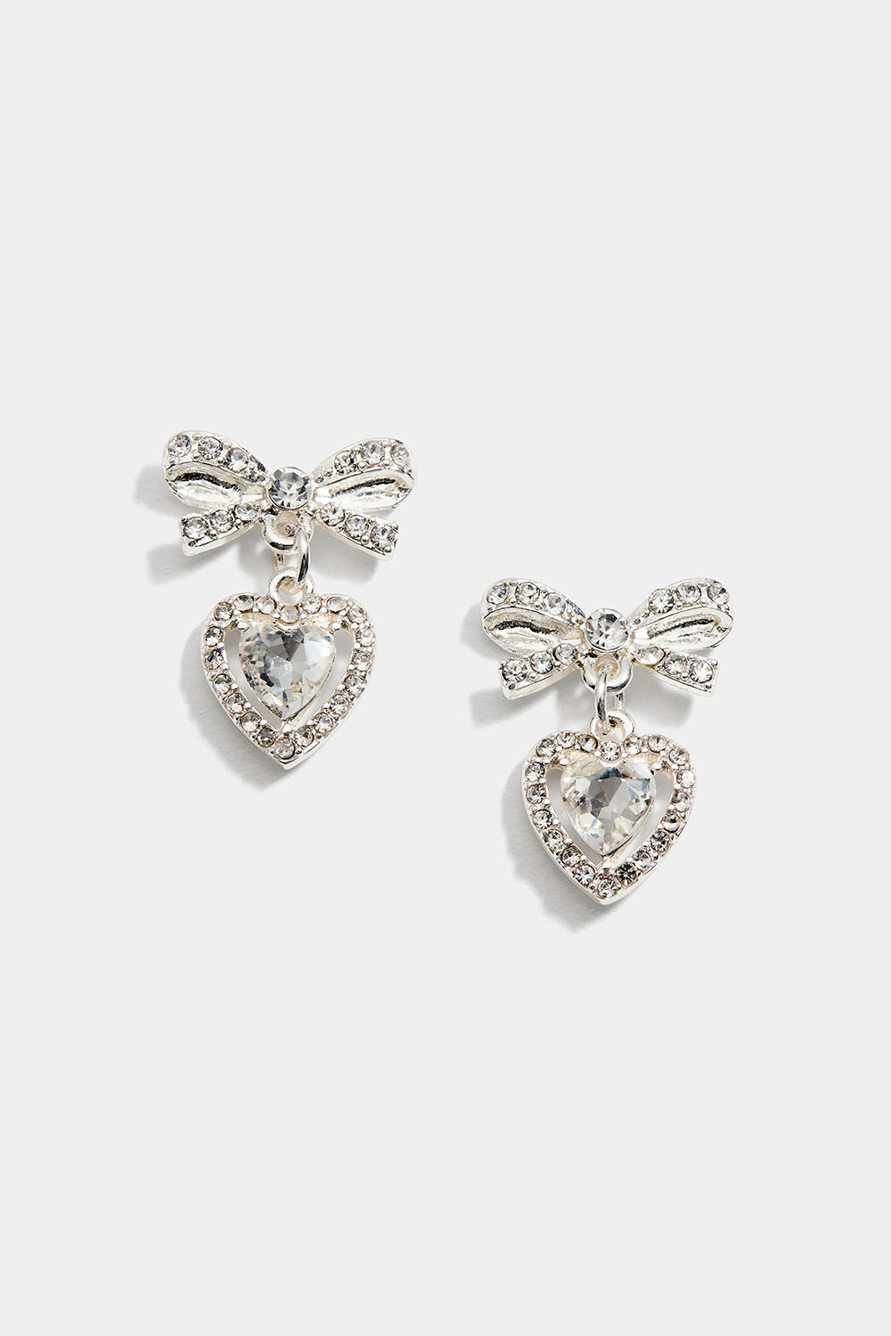 Øreringe i sølvfarvet metal med sløjfer og hængende hjerter dekoreret med rhinsten.