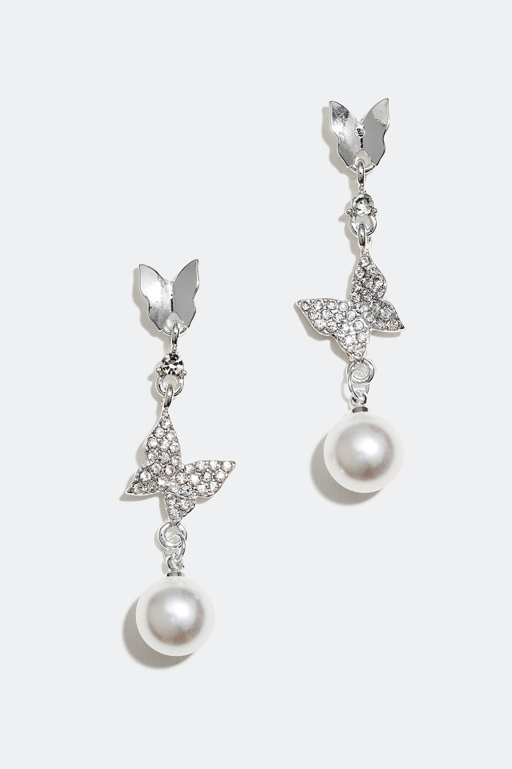 Sølvfarvede øreringe med hængende sommerfugle og en rund perle, hvoraf den ene er dekoreret med glassten. Et par dekorative øreringe med glitrende detaljer, der passer til både hverdag og fest.