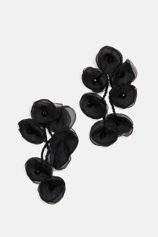Øreringe med små sorte glasperler og hængende sorte blomster i gennemsigtigt stof.