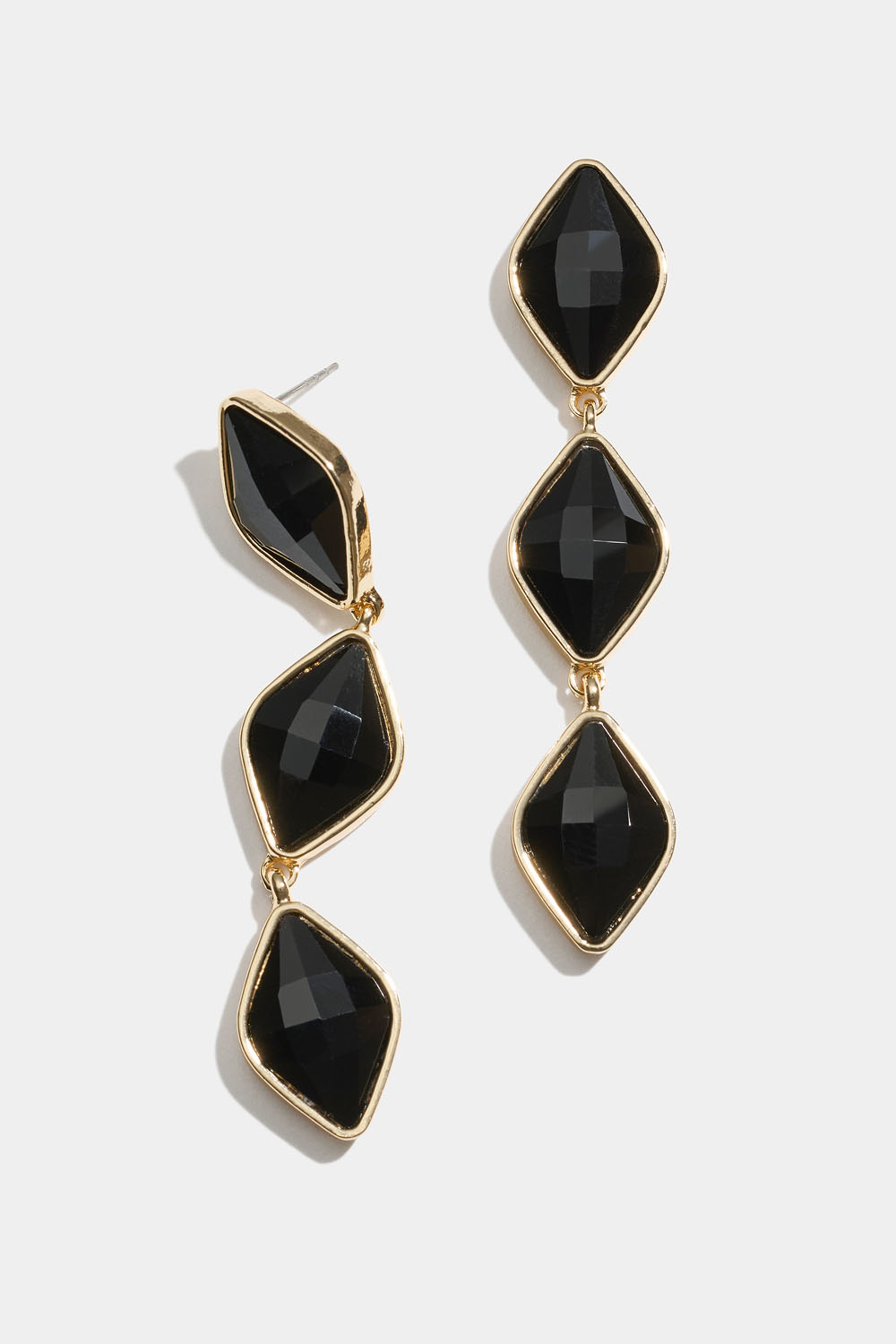 Øreringe i guldfarvet metal med tre, hængende, sorte glassten i diamantform.