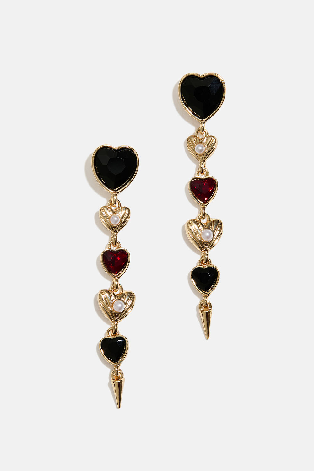 Hængende øreringe med hjerter i forskellige størrelser, dekoreret med sorte og røde glassten samt små hvide perler.