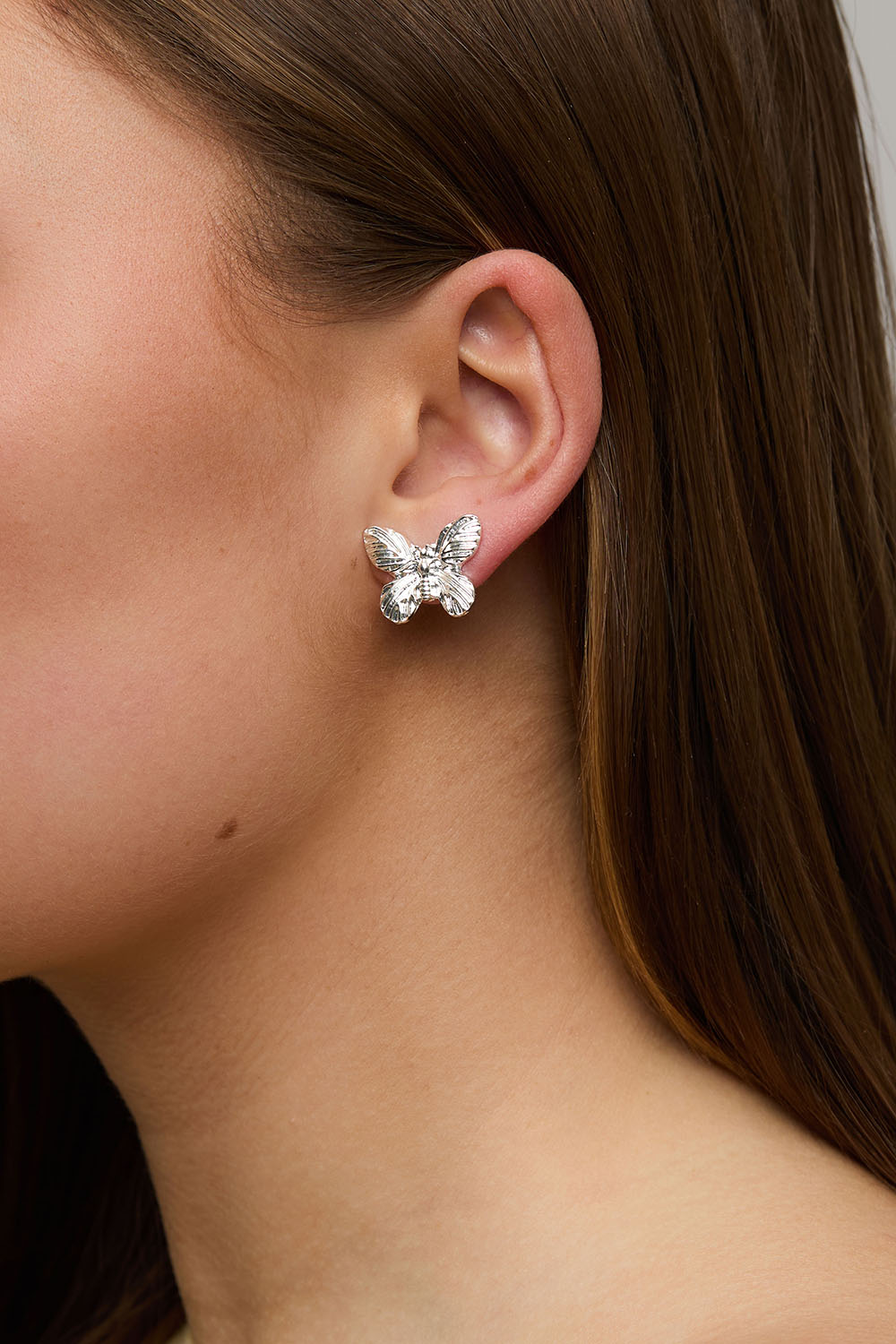 Øreringe i metal i form af sommerfugle med strukturerede detaljer.