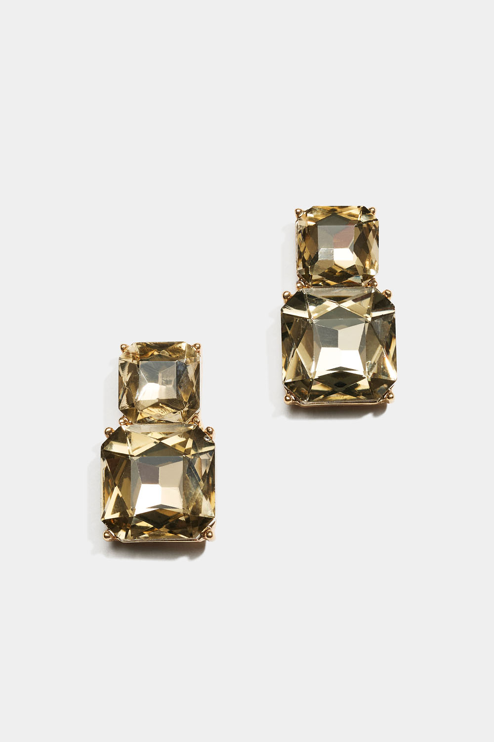 Ørestikker i guldfarvet metal med to kvadratiske, lysebrune glassten i forskellige størrelser.