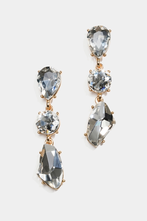 Øreringe i guldfarvet metal med tre, hængende, hvide glassten i forskellige former.