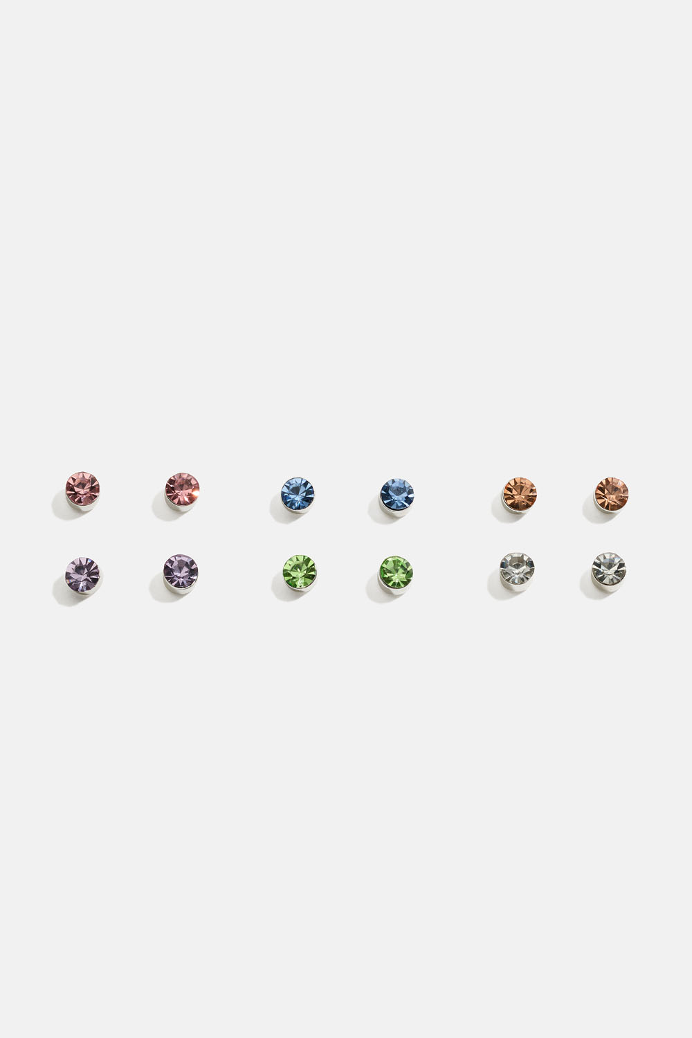 Ørestikker i sølvfarvet metal med glassten i lyserød, blå, beige, lilla, grøn og hvid. Kommer i en seks-pak.