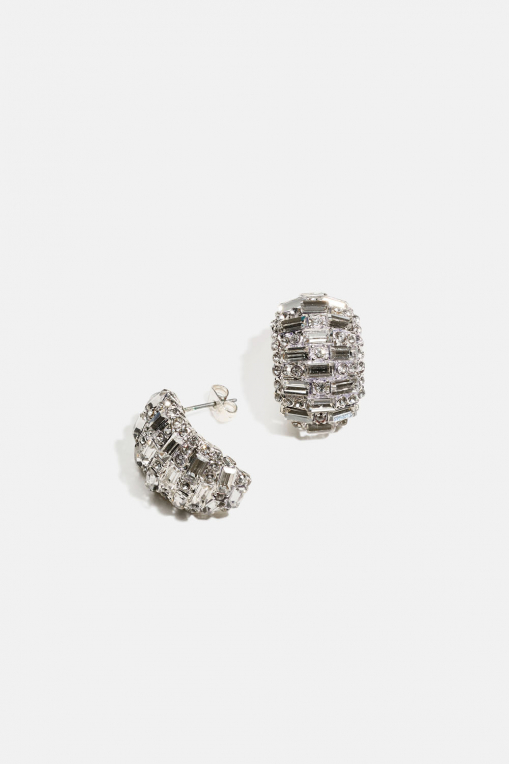 Ovale øreringe i en let buet form dekoreret med hvide glassten i forskellige former.