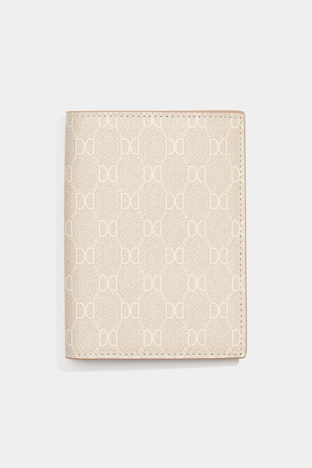 Beige etui med DD-mønster til pas i imiteret læder. Der er også fire kortholdere på indersiden.