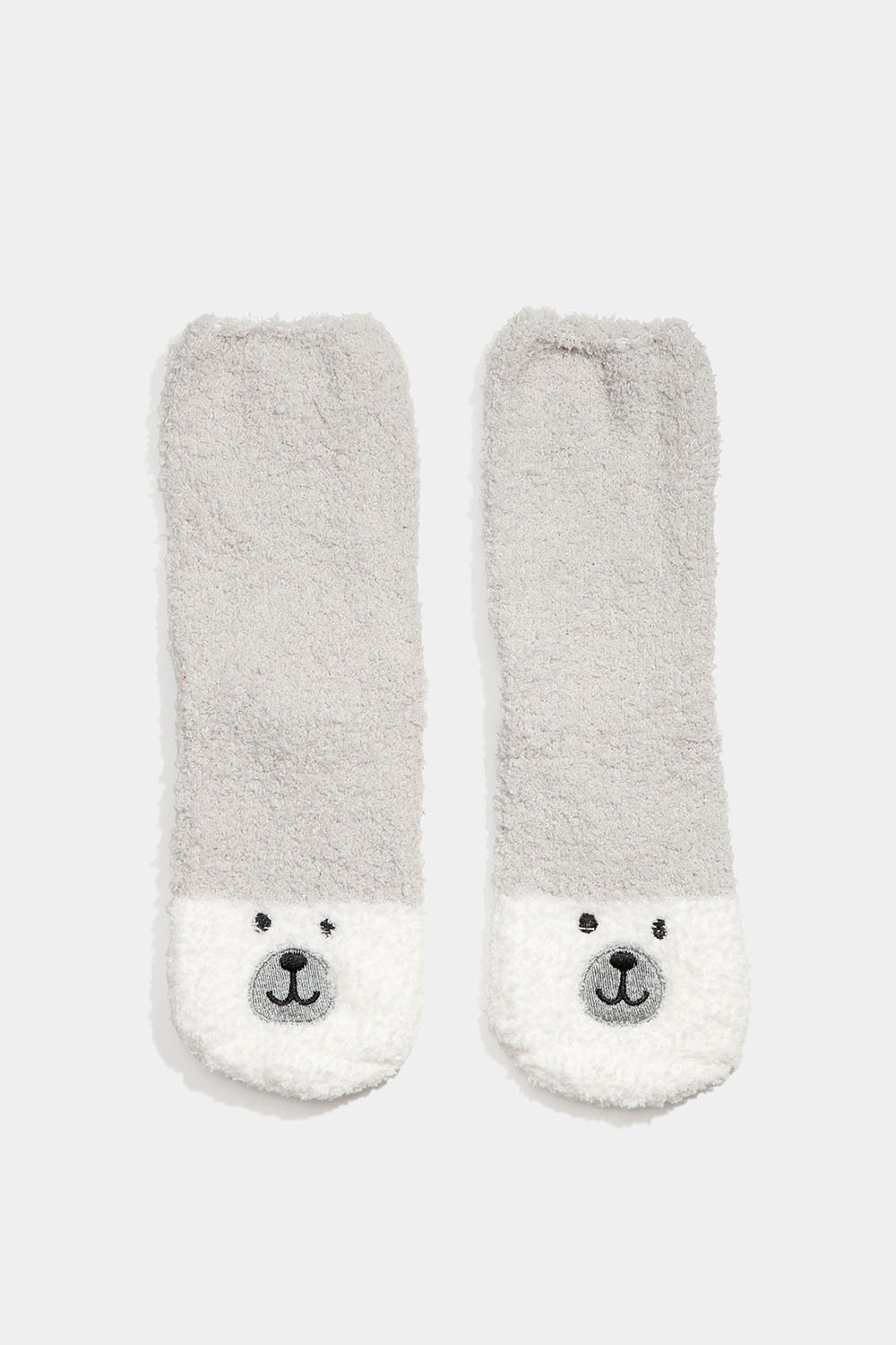 Plyssede hvide og grå sokker med broderet isbjørn. Varme sokker, der passer til alle.