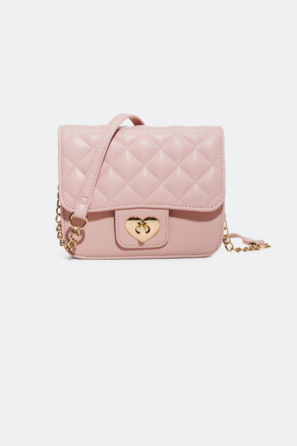 Sød quiltet skuldertaske med guldfarvet hjerteformet lås. Tasken er lyserød og skulderremmen i guldfarvet metal.