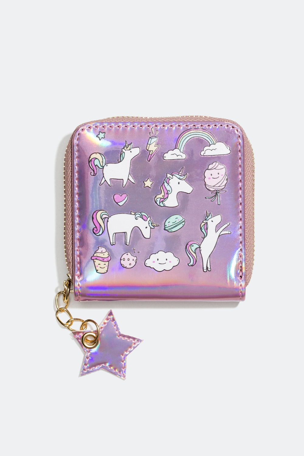 Lyserød pung i et skinnende materiale med motiver af enhjørninger, regnbuer, stjerner og meget andet. Pungen er sort på indersiden og har to rum. Punges åbnes og lukkes med en guldfarvet lynlås.