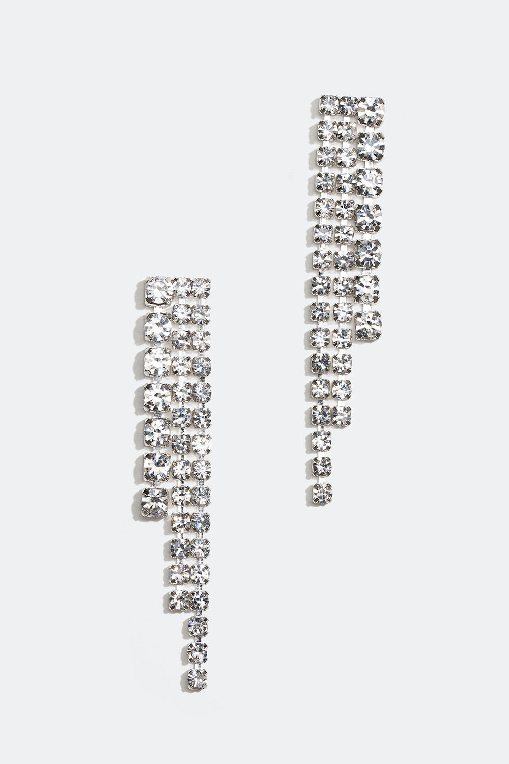 Øreringe med tre led i forskellige længder dekoreret med runde glassten i forskellige størrelser. Perfekte rhinsten-øreringe til festlige lejligheder.