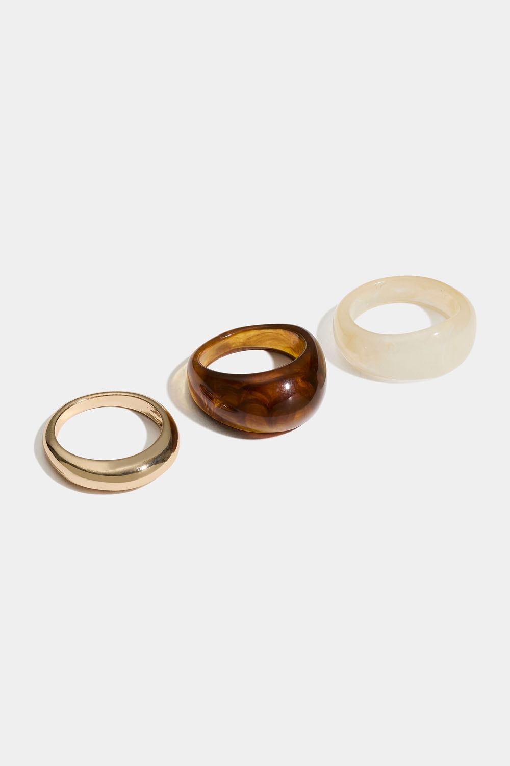 Tre ringe i organiske former. En i guldfarvet metal og to i beige og brun akryl.
