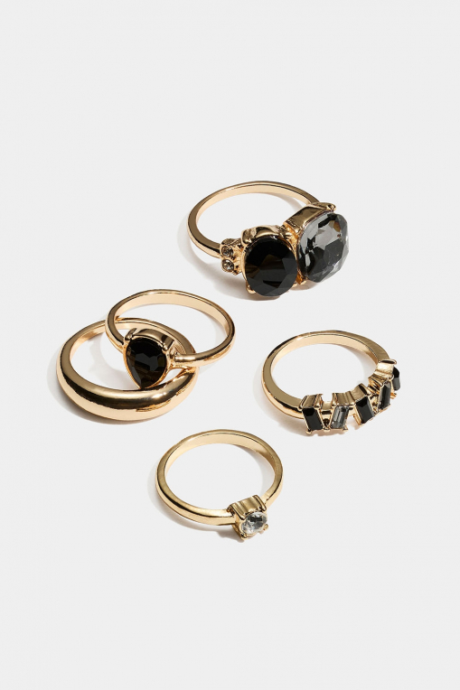 Ringe i guldfarvet metal med forskellige designs dekoreret med grå og sorte glassten. Leveres i 5-pak