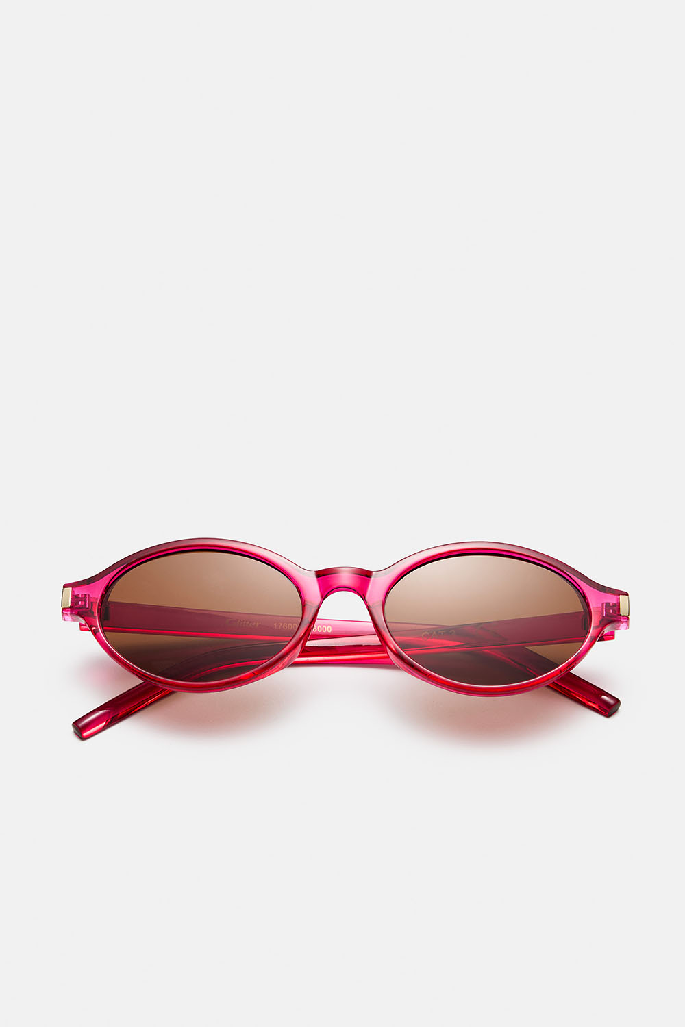 Smukke ovale solbriller med rødt, gennemsigtigt stel og guldfarvede detaljer. Et par stilrene klassikere, som hurtigt bliver en favorit.